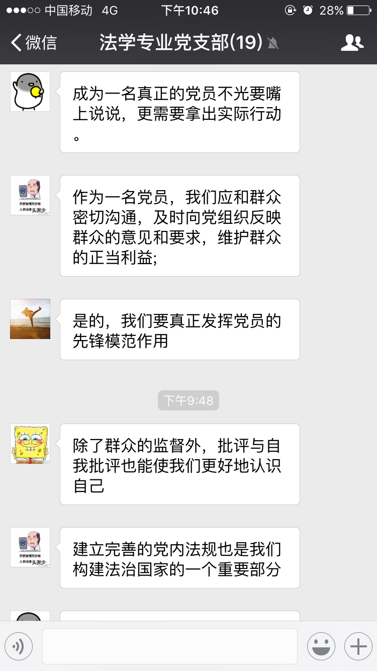 晚上21时,支部同学又约定时间,开启“理论学习模式”,共同学习了党的十八届六中全会精神,共同在微信群里研讨六中全会的各项内容和重要精神,同时也结合自身,内化于心,外化于形,落实到平时的学习和员工工作中。