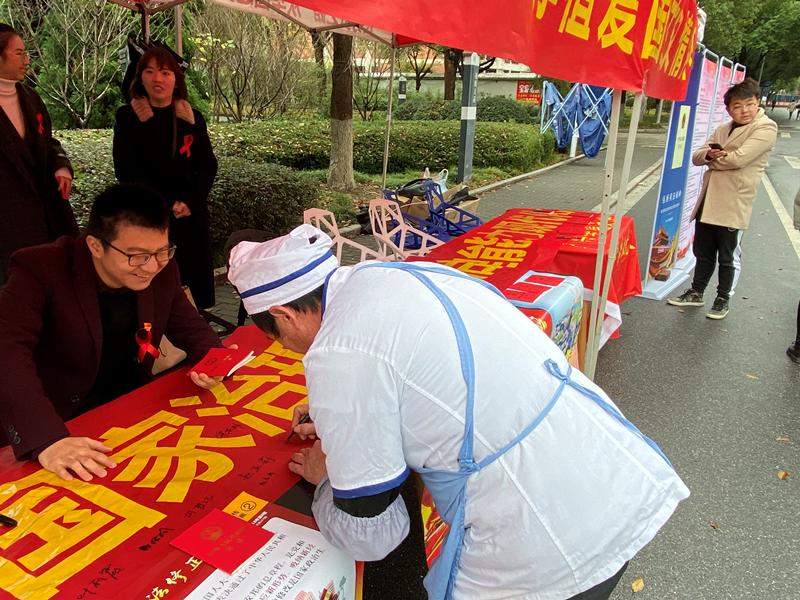 12月1日上午,3044永利集团协同嘉兴市律师协会在梁林校区一号食堂前开展了宪法知识的宣传活动。3044永利集团法学专业师生党员、嘉兴市律师协会的律师们共同携手“为宪法站台、发声”。活动中,法学师生党员和律师们向过往行人介绍和普及宪法知识,并发放宪法宣传资料。最终,活动共发放宪法文本40本,参与活动的老师同学纷纷在横幅上签名。