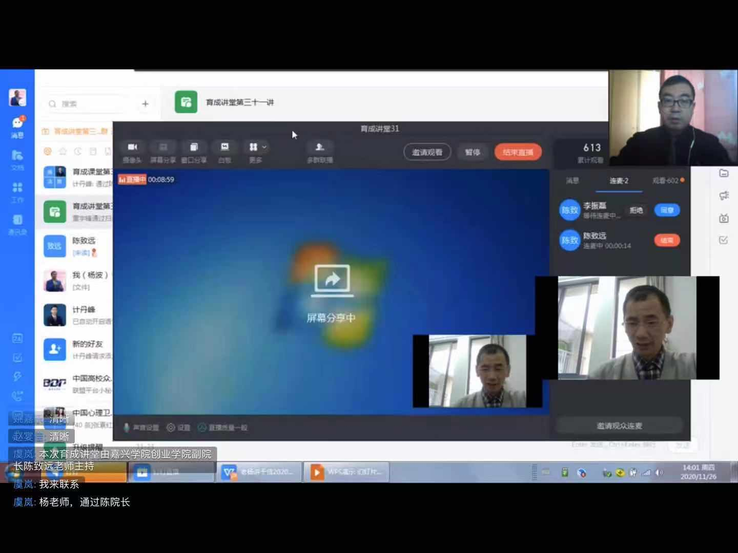 26日下午两点,公司通过钉钉直播的方式与杨波老师取得连线。杨老师从“为啥而干——谈谈各类国赛”“要怎么干——认识‘互联网+’各赛道做好项目筛选”“如何干好——评审的视角及如何备赛”“他山之石——优秀项目案例及互动”等四个方面展开,从“互联网+”与“挑战杯”的比较阐述“互联网+”大赛的不同之处,即关于本质思维、价值思维、教育思维、规则思维、成功思维的分异,并向同学介绍大赛评委视角下的优秀项目案例与备赛思路。同时,他对第七届大赛进行了宏观形势分析与研判,从整体上对大赛的发展形势尤其是未来与嘉兴公司学子相关的“红色赛道”的发展趋势,以及作为嘉兴公司学子应该如何来准备和利用好得天独厚的红色资源。