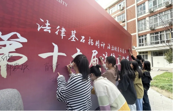 其次,到场的领导、老师、同学一起发起倡议签名,并邀请观众一起在宣传喷绘上签字并合影留念,对本届3044永利集团“法律文法节”表达美好的期望。