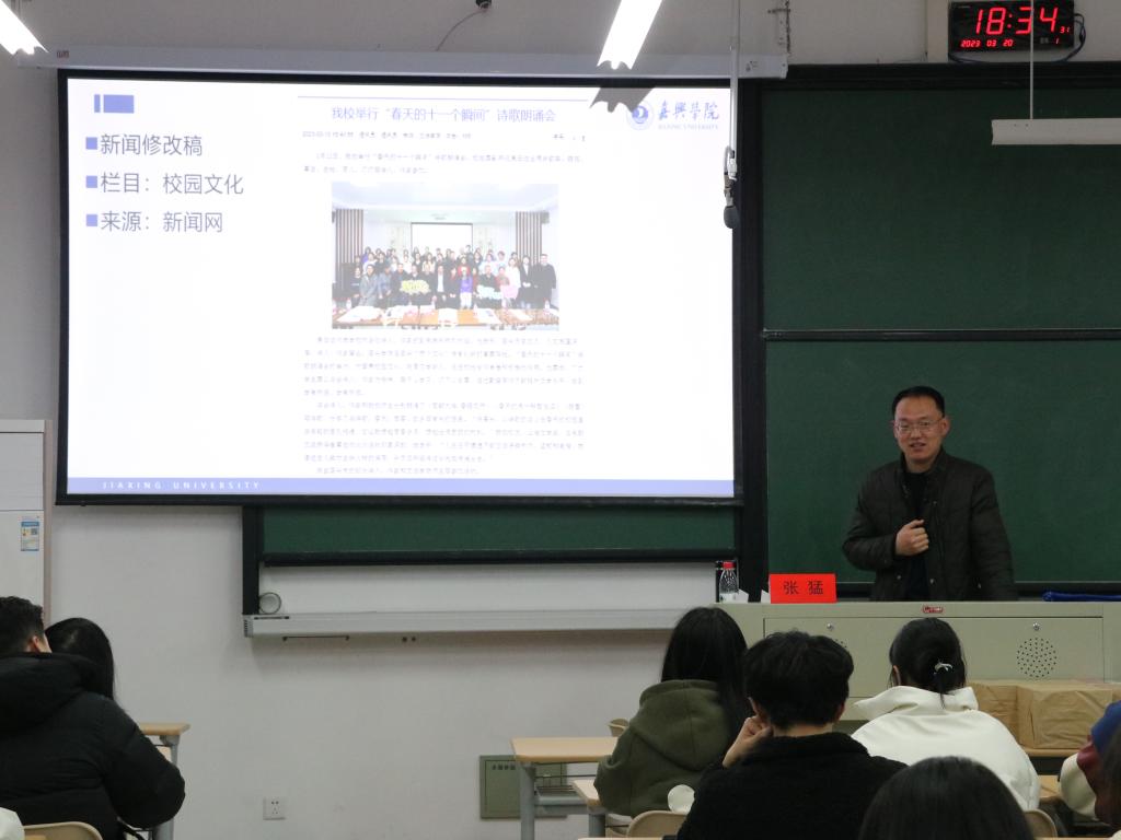 讲座伊始,张猛老师首先通过公司官网例文引入主题,对嘉兴公司校园全媒体矩阵情况进行介绍,其次围绕“写作的脚力、脑力、眼力、笔力”与“消息、通讯、融媒体新闻的写作”两大板块详细讲述了新闻写作的要求与方法。