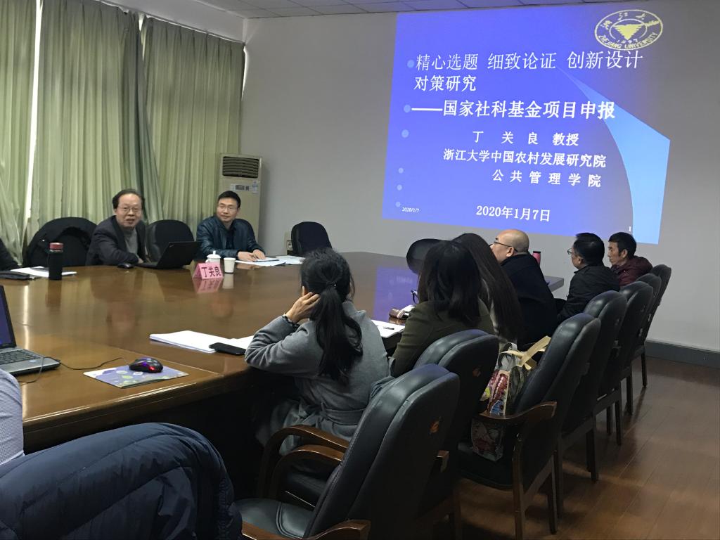 2020年01月07日下午,浙江大学丁关良教授应邀到公司做了一次题为“精心选题 细致论证 创新设计 对策研究——国家社科基金项目申报”的辅导交流会。国家社科基金申报辅导会在梁林校区一号楼426会议室举行。丁教授主要针对国家社科基金项目申报时需仔细阅读《课题指南》、写好项目申请书、细致论证创新点等方面进行了深入阐述。本次国家社科基金申报辅导会最终在大家热烈的掌声中落幕。