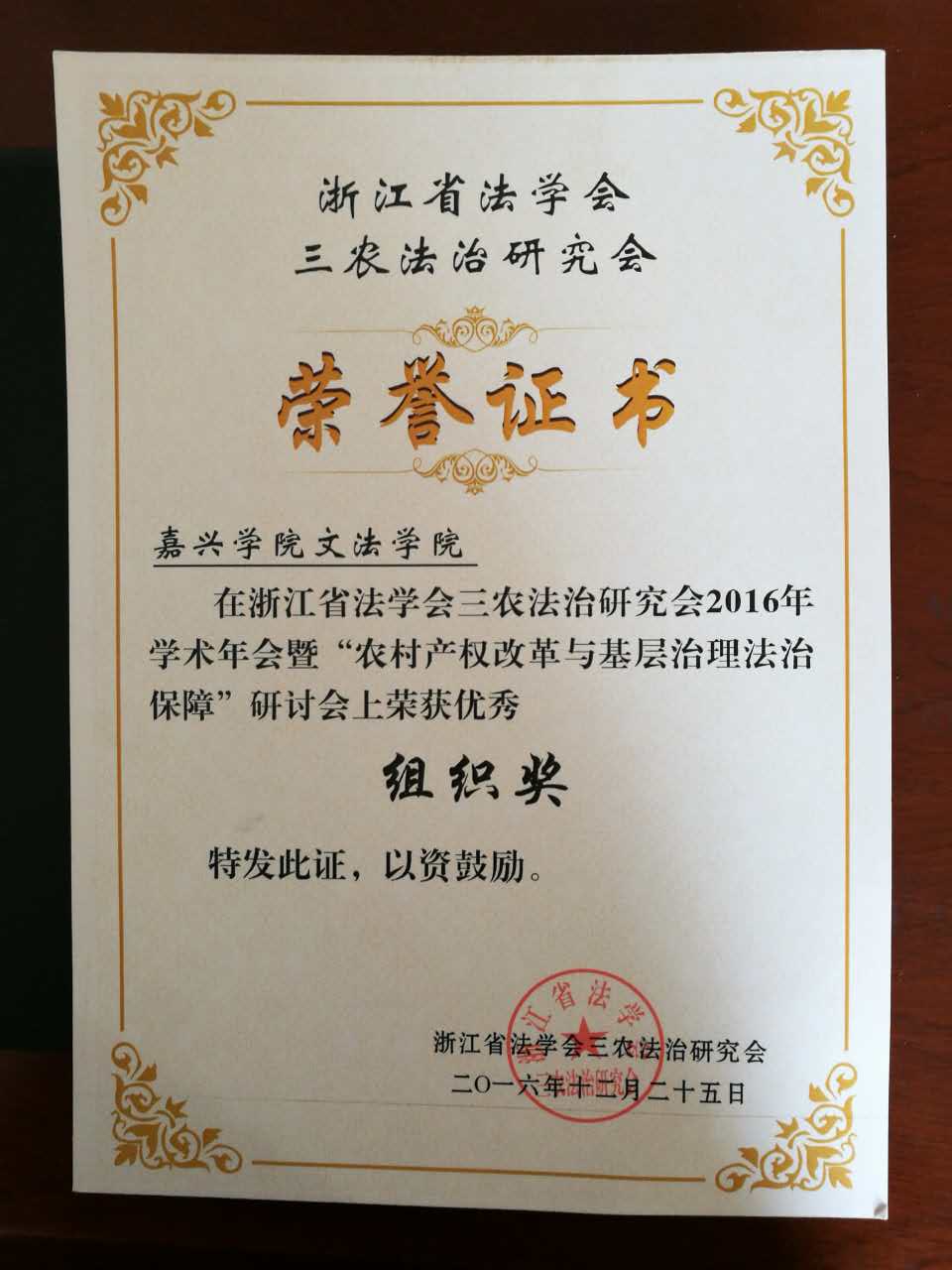 此次年会就两个专题,即“农村产权改革法治保障“和“农村基层治理法治保障”进行了研讨。中心成员马存利博士和杨华国博士分别就“PPP模式下我国农村环境治理的法治保障——以水污染治理为例”和“从压力型体制看嘉兴市河长制的制度逻辑”在大会进行主题发言,相关思路和观点获得与会专家的高度赞扬。此次会议,我中心成员共提交9篇学术论文,分别涉及农村土地、合作社治理、农村环境治理及农村商品质量安全监管等主题。提交的参会论文中,罗士俐博士的论文获得一等奖,李凤琴副教授、马存利副教授、向勇副教授、李勇军副教授、杨永磊博士、李滇博士的论文获得二等奖,马聪博士、杨华国博士的论文获得三等奖,嘉兴公司3044永利集团获得优秀组织奖。相关选题和所获奖项在很大程度上彰显了我中心在“三农”法治研究方面的水平和实力。