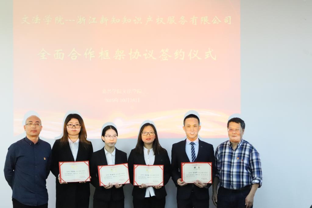 仪式上,双方签署了全面合作框架协议,并为浙江新知知识产权服务有限公司进行“嘉兴公司校外实践实训基地”授牌。随后双方互相颁发了兼职人员聘任证书。