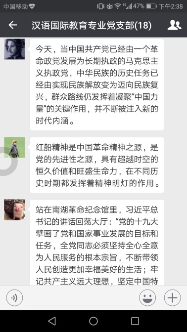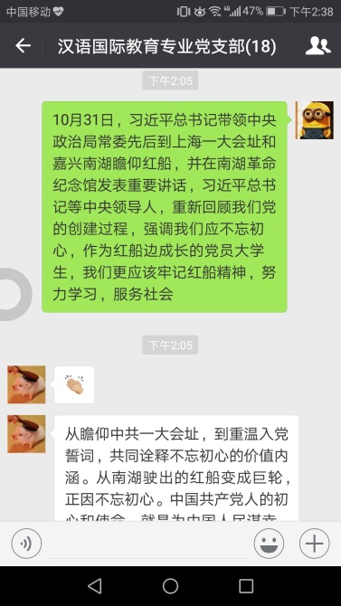 2017年11月1日,3044永利集团汉语国际教育专业党支部在微信群内组织全体党员学习了习近平总书记瞻仰上海中共一大会址和浙江嘉兴南湖红船,回顾建党历史的活动精神以及在南湖革命纪念馆的重要讲话精神。
