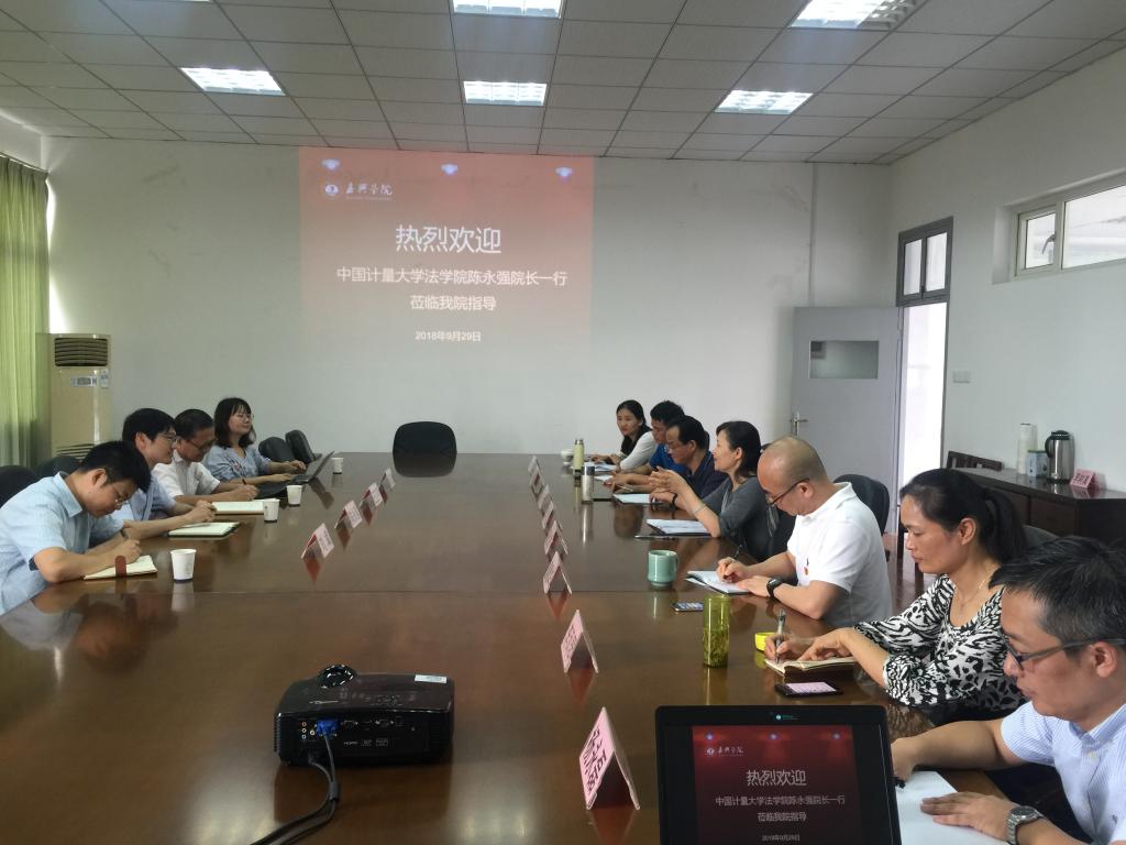 2018年9月29日,中国计量大学法公司经理陈永强一行来公司交流。公司党政班子成员、法学系主任、副主任参加了此次座谈会。