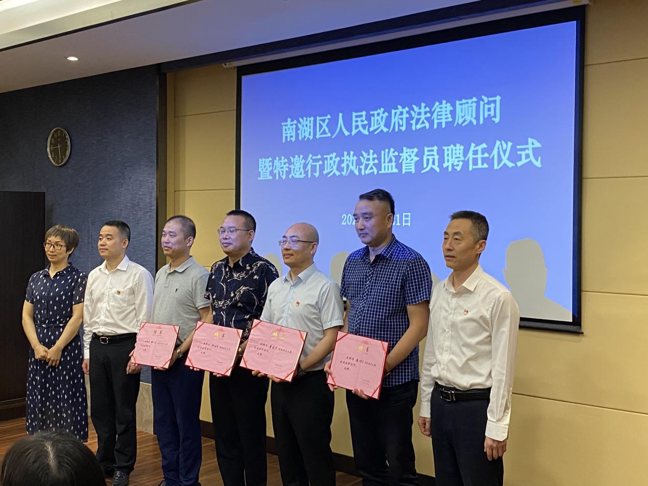 5月21日上午,在南湖区政府10号会议室,3044永利集团副经理童建华受聘为南湖区人民政府法律顾问和特邀行政执法监督员。