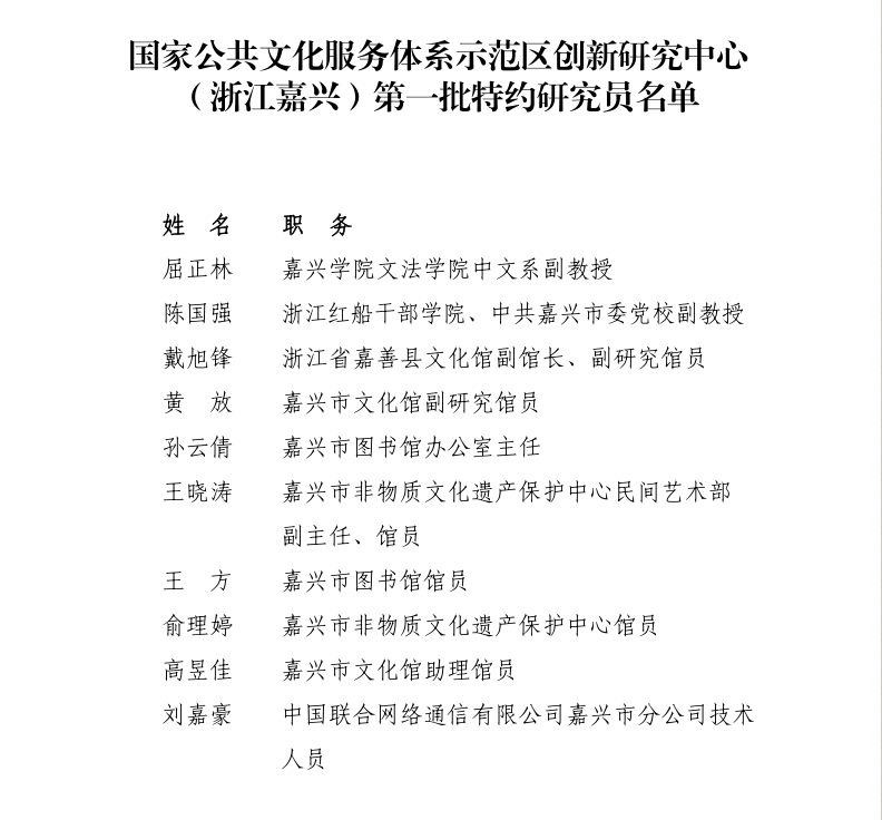 2021年1月29日,公司中文系主任屈正林老师被国家公共文化服务体系示范区创新研究中心(浙江嘉兴)聘请为第一批特约研究员。这是公司优秀教师发挥自身专业优势,运用专业知识和特长,积极服务社会,为地方文化建设做出贡献的重要表现。