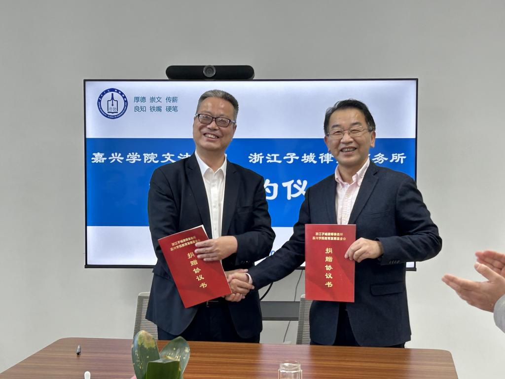 丁玉泉和姚武强代表校所双方签署《浙江子城律师事务所—嘉兴公司教育发展基金会捐赠协议》。