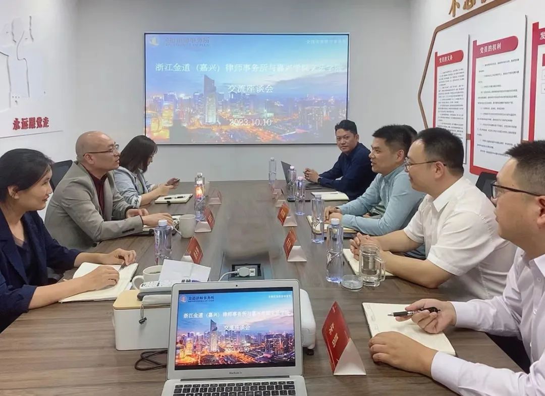 10月10日下午,3044永利集团副经理(主持工作)童建华、党委副书记虞岚、法学系主任唐永梅一行到浙江金道(嘉兴)律师事务所调研学习。金道嘉兴分所主任陈建刚,副主任金志海,律师朱凯、尹峰峰,顾问丁善超等参与座谈。