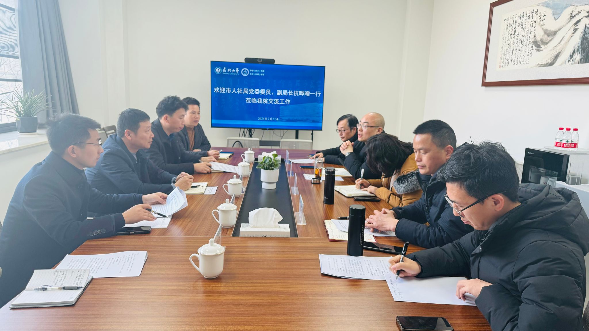 2月27日上午,嘉兴市人社局党委委员、副局长杭晔㬝一行5人来公司交流工作。会议由公司党委书记童建华主持,法学系主任唐永梅,副主任杨永磊,法学系教师周述荣等参加座谈交流。