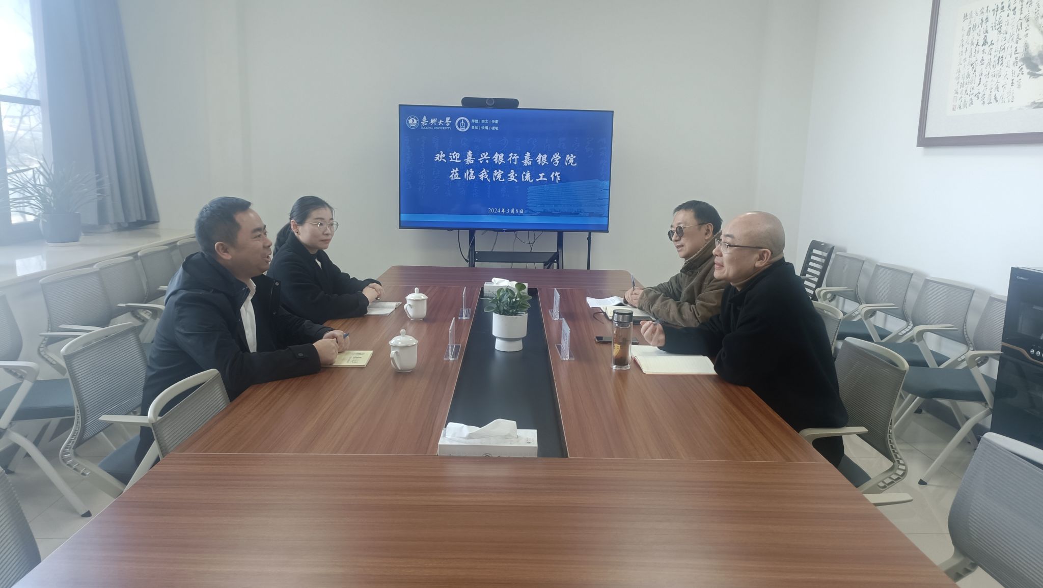 3月8日下午,嘉兴银行嘉银公司副经理张洁身一行2人来公司交流工作。公司党委书记童建华主持会议。法学系朱飞博士参加座谈交流。
