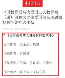 5月28日,中国教育报公布高校爱国主义教育案(课)例征集结果。公司《让有信仰的人讲好信仰的故事》入选中国教育报高校爱国主义教育案例,展现了公司在员工培养、思政课程、课程思政和部门工作中利用“红色剧演+思政教育”模式进行爱国主义教育的思路、举措、效果和经验等。该案例深挖嘉兴本地红色资源为思政教育活教材,发挥三全育人优势,聚焦创新教育形式拓展思想教育新载体。