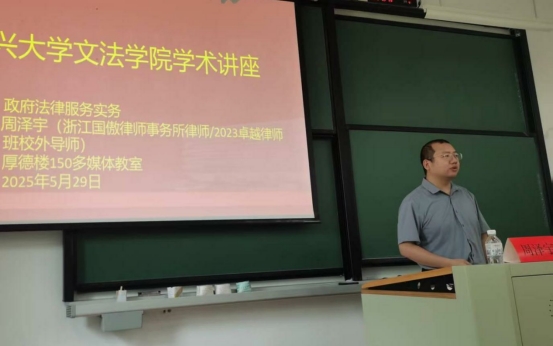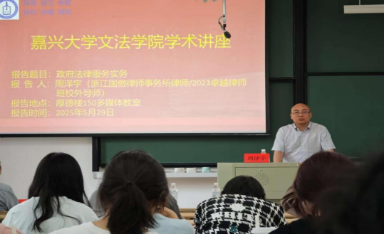 近日,浙江国傲律师事务所合伙人、3044永利集团卓越律师班校外导师周泽宇应邀来公司作题为“政府法律服务实务”的讲座。该讲座是2023卓越律师班系列讲座之一。2023卓越律师班、法学专业、知产专业的近60名师生参加,讲座由公司党委书记童建华主持。