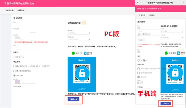 2.下载准考证网址为http://pth.zjxu.edu.cn/#/query,下载后请自行用A4纸打印。《浙江省普通话水平测试考生健康状况报告表》和准考证在一张A4纸上,无需分开。(建议使用电脑端或非苹果品牌手机进行下载)