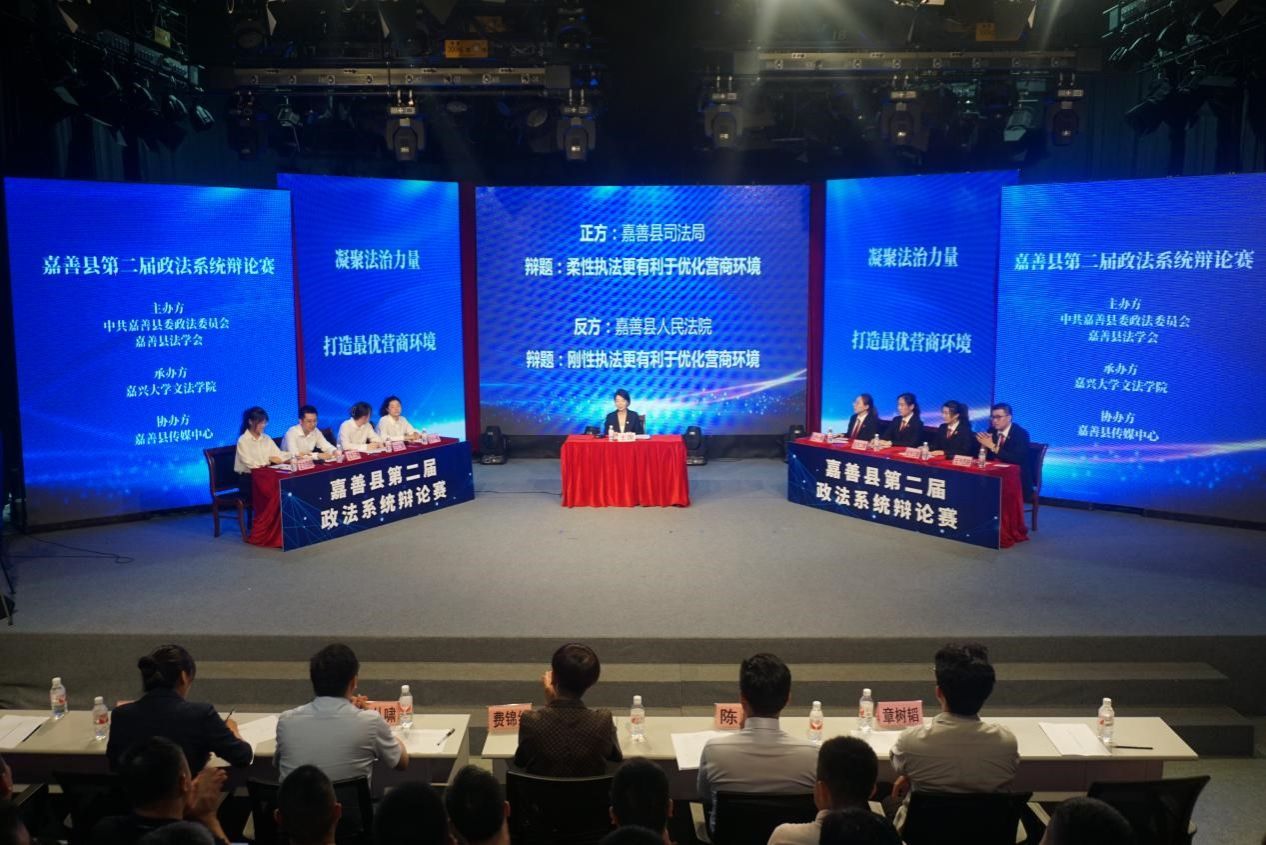 本次辩论赛决赛中,嘉善县司法局辩论代表队和嘉善县人民法院辩论代表队围绕“柔性执法更有利于优化营商环境/刚性执法更有利于优化营商环境”这一辩题展开激烈角逐。