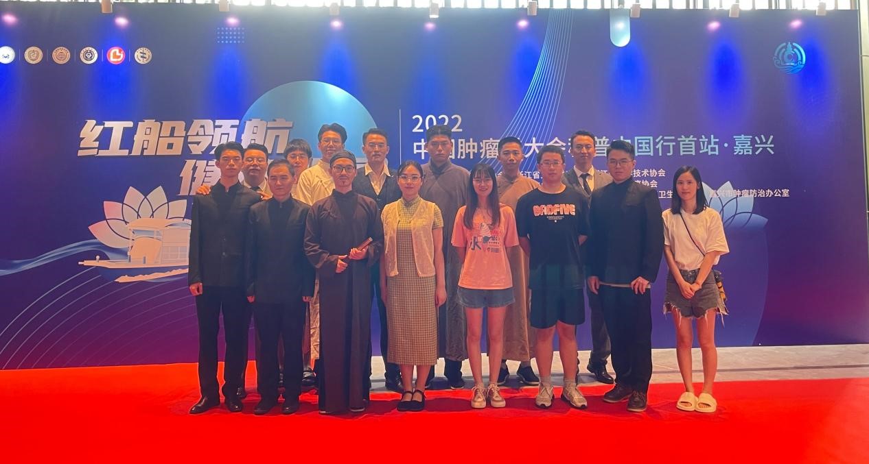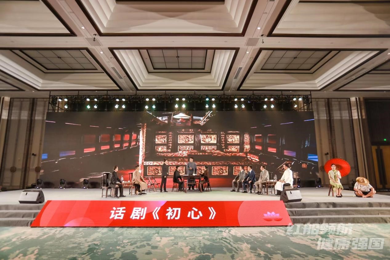 79日,嘉兴公司原创红色话剧《初心》片段——南湖会议在“红船领航 健康强国”2022中国肿瘤学大会科普中国行首站·嘉兴站演出。